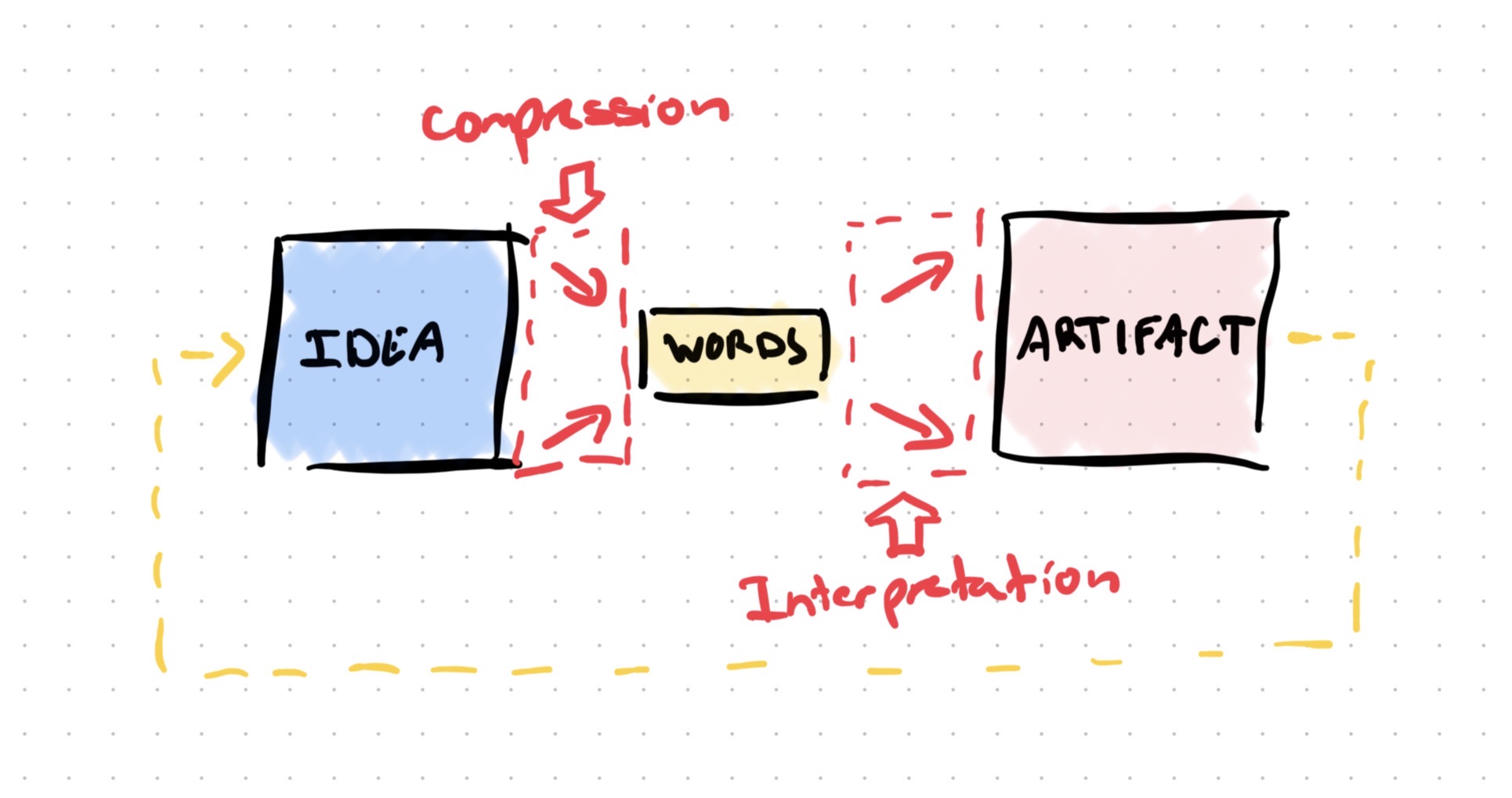 AI jumps straight to prototype-level output from words. The problem with that? Ideas are rich, contextual, full of nuance. Words are a compressed, lossy format. When someone says "make it intuitive," there's a complex idea behind that request, shaped by their experience, their frustrations, their context. But all of that gets squeezed down into three words. It's like compressing a high-res image into a tiny JPEG. The file gets smaller, but the detail disappears.